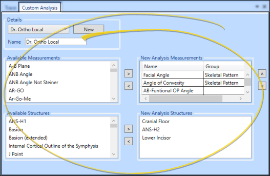 Your custom analysis will include each item in the the New Analysis Measurements and New Analysis Structures columns. You can use the [<] and [>] arrows to move structures from one column to the other, and the [^] and [v] arrows to rearrange the selected structures. When you trace a ceph, you will be prompted to place the selected structures in order, from the top down..