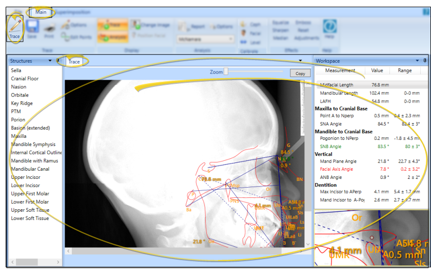 Zoom Window - You may or may not see the structure markings in the Zoom Window at the bottom portion of the Workspace area, depending on your SmartCeph settings. We recommend you use the Zoom Window to achieve the most precise tracing.
