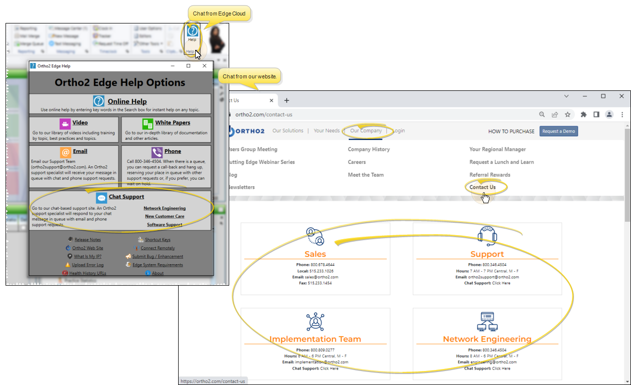 For more assistance, please contact the Ortho2 Network Engineering team at 800-346-4504, or engineering@ortho2.com. Or use the Chat link from the Edge Cloud Help menu or from the Ortho2 website Contacts page.to open a chat session for real-time help from ourNetwork Engineering,Implementation team, or Software Support teams.