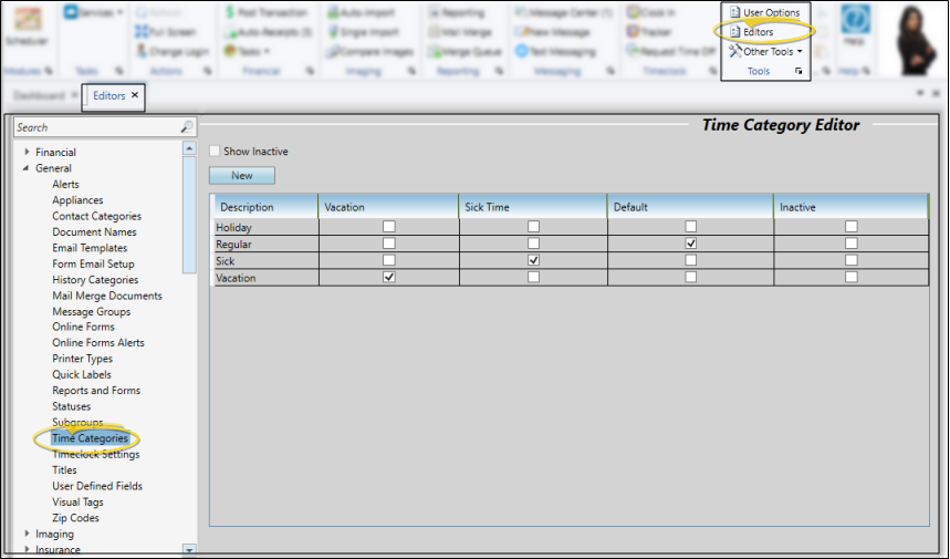 Your Time Categories editor must include at least one category that is flagged as "Vacation" and/or "Sick" to be able to integrate Timeclock PTO and sick leave entries with your employees' HR Manager benefit accrual balances. See "Time Categories Editor" for details about creating these categories.