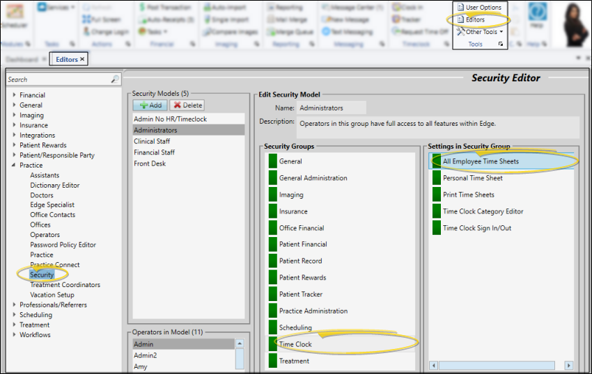 Only operators with full security access to the All Employee Timestamps setting of the Timeclock security group can enter or edit other employee time stamps. See "Security Editor" for details about setting up security access.