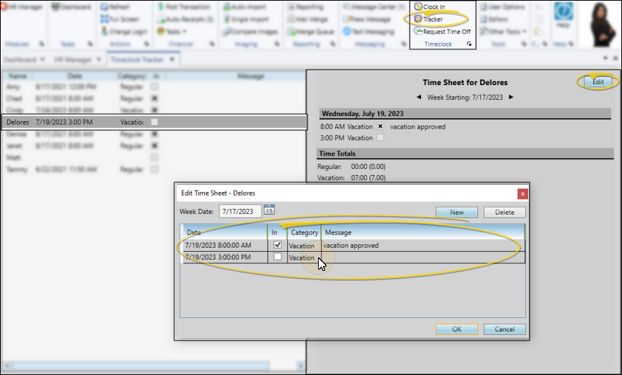 Select the employee to work with at the left of the window. Then, in the right side of the window, click Edit and enter new Time In and Time Out stamps for the time the employee will be absent. Be sure each time stamp is assigned to the appropriate "Vacation" or "Sick" category. This will assure that the time will be flagged as PTO and not earned hours, and will be reflected on the Vacation window of the employee's HR Manager record. See "Timeclock Tracker" for details about creating and editing time stamps.