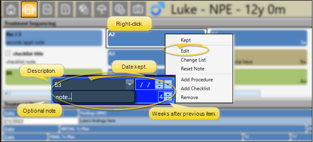 Right-click a treatment sequence item and select Edit. You can then change the procedure code of an appointment item, or the description of a checklist item. You can also update the number of weeks to schedule after the previous item, the date the item was completed, and any associated note. You cannot change a procedure item into a checklist item, or vice-versa.