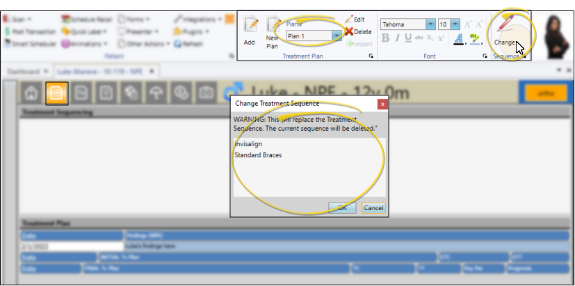 First, confirm that you have selected the appropriate plan in the Treatment Plan section of the ribbon bar. Then, click Change in the Sequence section of the ribbon bar, and select the treatment sequence template to apply.