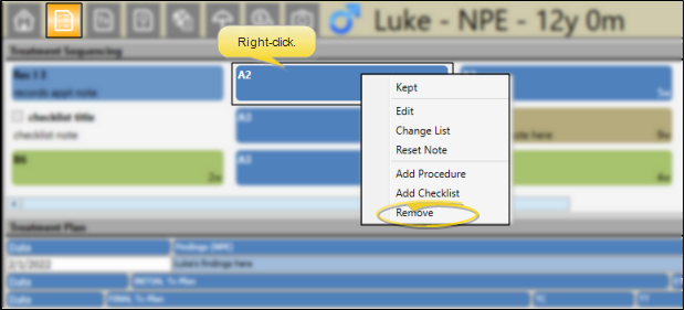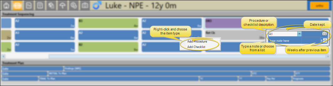 Right-click anywhere in the treatment sequence section of the window and choose the item type you want to add: Appointment procedure or Checklist.