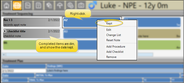 Process as "Kept Today" - If you right-click an item in a treatment sequence, and flag it as Kept, that item is marked with today's date, regardless of the actual appointment date.