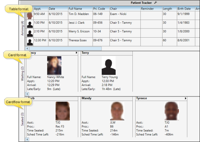 Format - (Patient Tracker module setting only.) Choose how to display the patient data in your Patient Tracker: The Table format shows you each patient's information in a single row; the Card format shows you each patient's information in business card style; the Cardflow format also uses a business card style, but you includes additional details. You can choose a different format for each section of your Patient Tracker module. The Patient Tracker widget always uses the Table format.