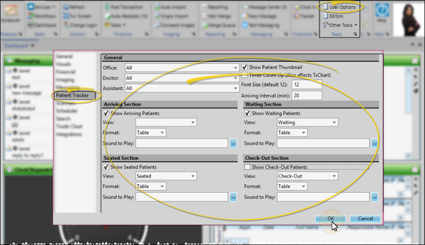Open the User Options window from the File, Home, Patient, or Scheduler ribbon bar. Then choose the Patient Tracker tab to open the User Options window for your Patient Tracker module.