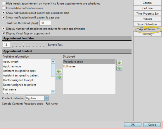 Appointment Content / Delimiter - Use the left / right arrows to add and remove the information you want to display in your scheduled appointment cells. You can use the up / down arrows to re-order the items. Also, select a content delimiter, such as a hyphen, to separate each type of information.
