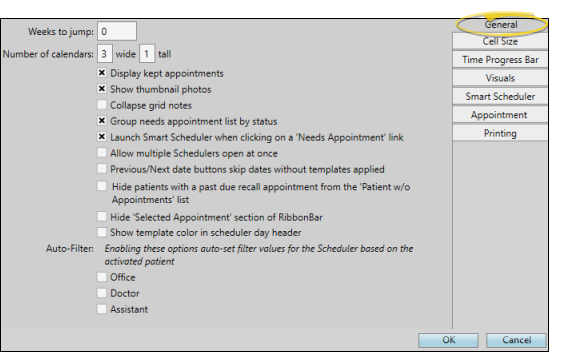 Auto-Filter - You can automatically filter the Scheduler's displayed appointments, based on the currently active patient, by enabling one or more category in the General user options window: Office, Doctor, and Assistant. When at least one category is enabled, the filter(s) will adjust according to the information in the active patient's folder, which is not necessarily the information in the patient's scheduled appointment.