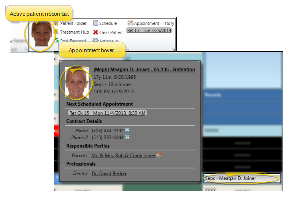 Regardless of what you display in appointment cells, information such as the doctor, office, and assistant assigned to both the patient and the appointment, are always available when you hover over the appointment in your Scheduler.