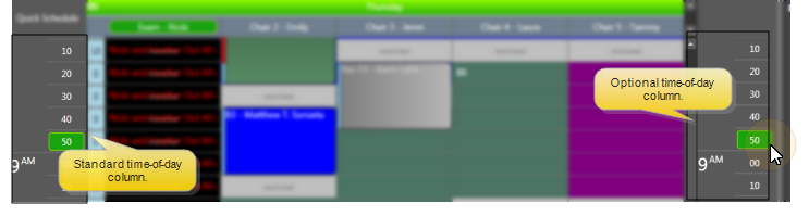 Doctor Time Settings - Your schedule can show you how many minutes of doctor time is scheduled for each time slot, and exactly where that time is located. This feature is controlled by several settings.