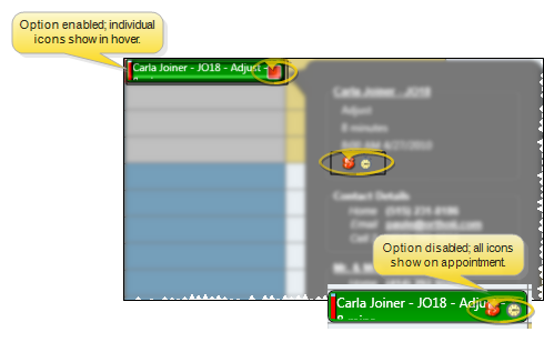 Consolidate Notification Icons - Special icons appear on your patients' appointments to notify you of certain situations and events. Disable the Consolidate Notification Icons user option to include all icons on the patient's appointment, or enable the option to display a single red box, indicating notifications are available. You can then hover over the appointment to display the individual notifications.See "Your Scheduler" for details about what each icon represents.