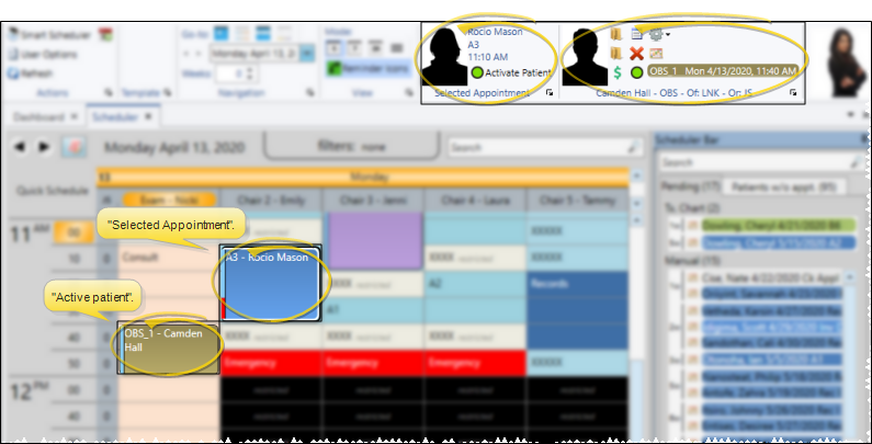Hide Selected Appointment Section of Ribbon Bar - Enable / disable the Hide Selected Appointment Section of Ribbon Bar option to omit / include the section of the Scheduler ribbon bar that shows which appointment your cursor is currently on. This may or may not be the same as the "Active" Scheduler patient.