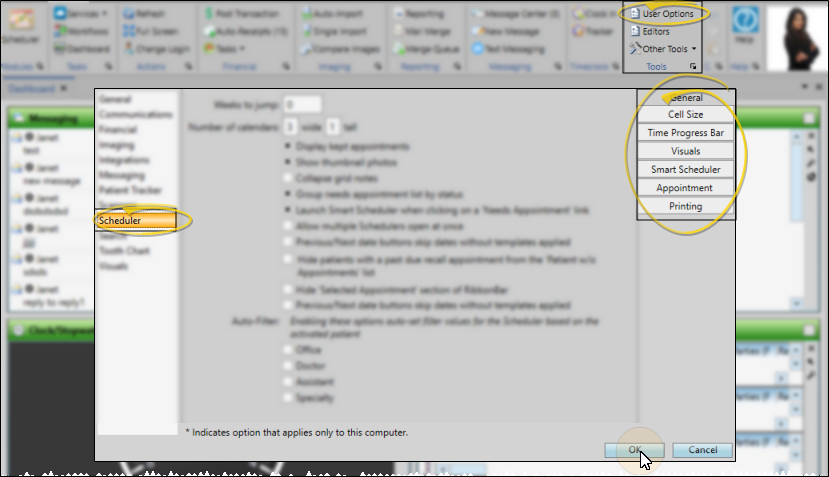 Use the Smart Scheduler user options to set up many choices that define how your Smart Scheduler works for you, including how many available appointments to list in your search window, using Doctor Time scheduling, and applying default doctor, office, and assistant filters. These settings are defaults only: You can enable / disable these features while using the Smart Scheduler