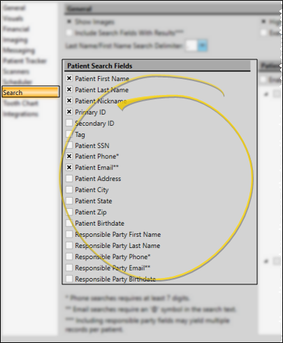 Use the Patient Search Fields section of the Search User Options window to select which patient folder and responsible party fields to use as search criteria: Any other data is ignored. The more search fields you enable, the slower the search can become. If you are having difficulty locating a patient, you can enable additional search fields as needed.