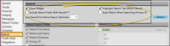 Open the User Options window from the File, Home, Patient, or Scheduler ribbon bar. Then choose the Search tab.