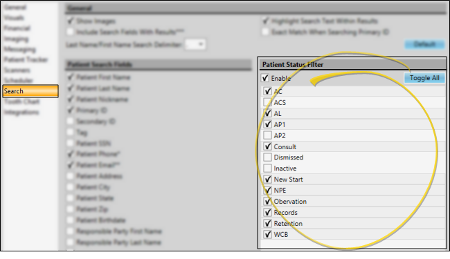 Enable the Status Filter option, then select the patient statuses to include in your searches. You can use the Toggle All button to select / deselect all status descriptions, or select statuses individually. Patients in any other status will be ignored. This feature is particularly useful for speeding up the search process when you have a large database of patients with a status such as Dismissed.