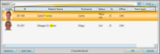 Enable this option to include the data from each search field you have enabled in the patient results window. If you include responsible party search fields, the patient may be listed multiple times in the results window. If this field is disabled, the results window will include basic patient information, such as the patient ID, patient name, nickname, status, assigned orthodontist and office.