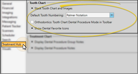 Use your Treatment Hub user options to choose your primary tooth numbering method, determine how your tooth chart is displayed in patient folders, and choose additional details to include on the Treatment Hub screen. Your security rights must include full access to the User Options Editor setting in the Practice Administration security group for this feature to work for you.