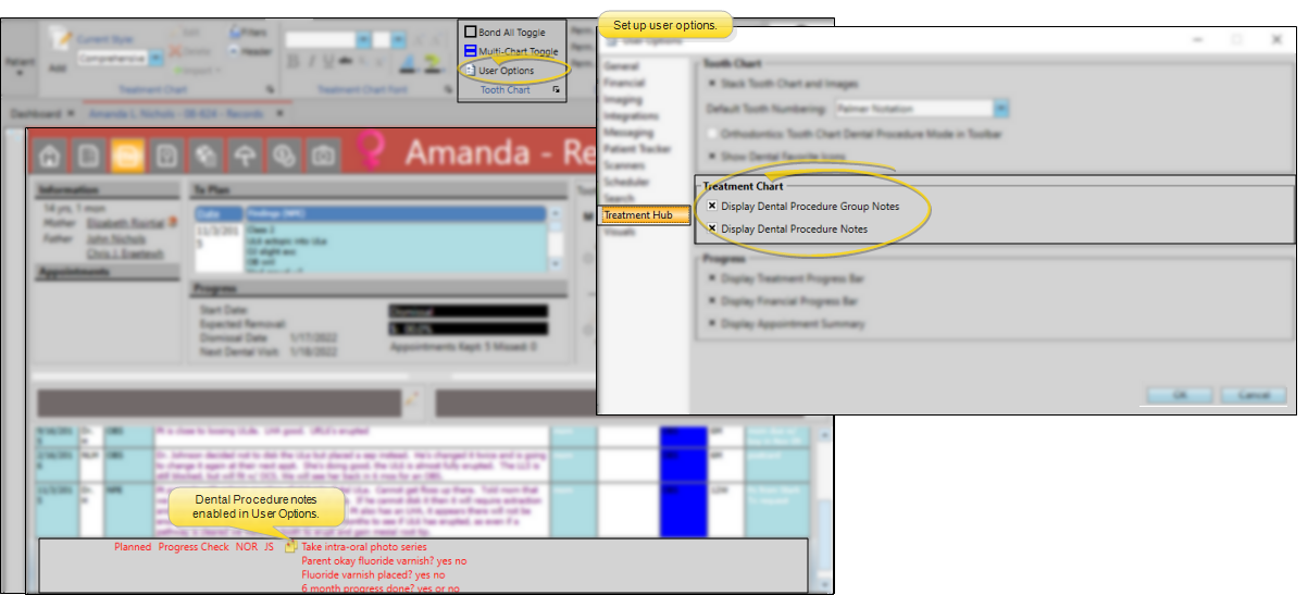 Use the Treatment Chart section of your Treatment Hub user options to choose whether to show or hide dental procedure notes and dental procedure group notes within your Treatment Chart records. If displaying notes is disabled, the Notes icon will still appear in the Treatment Chart record when the procedure or group contains notes.