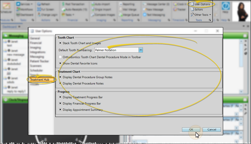 Open the User Options window from the File, Home, Patient, or Scheduler ribbon bar. Then choose the Treatment Hub tab.