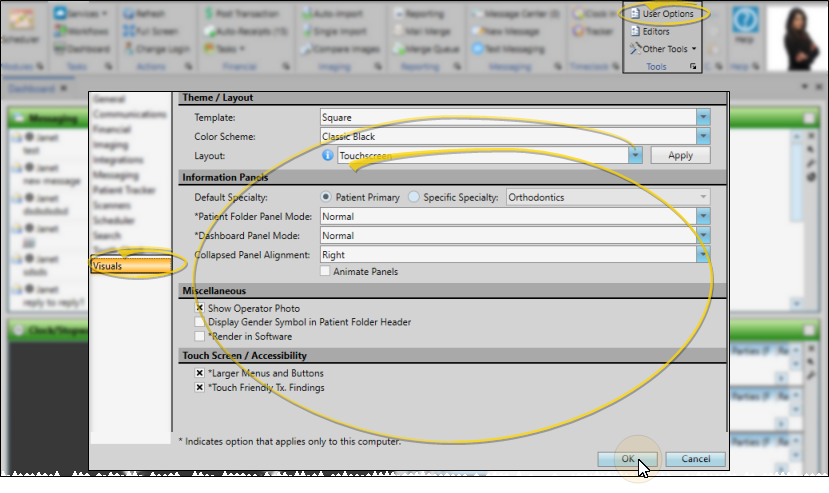 Open the User Options window from the File, Home, Patient, or Scheduler ribbon bar. Then choose the Visuals tab.