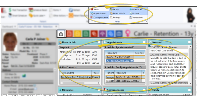 Normal - With Normal mode enabled, you use the Panels section of the Patient ribbon bar to select which information appears on the patient folder Home page: The more panels you select, the smaller the space available for each panel. You double-click panel headings to toggle expanded / normal view as needed. This mode is enabled by default when you apply either the Default or Touch Screen layout.