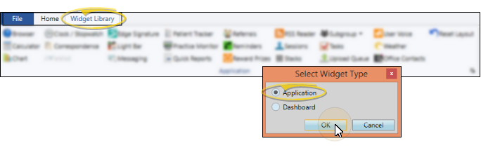 From the Application section of the Widget Library ribbon bar, choose the widget you want to work with, and select to open it as an Application widget type. The widget appears in its own window on your screen.