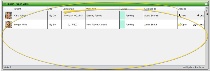 Use the inVisit widget to stay on top of your patients' virtual visits in real time. The widget lists your open virtual visits, and is refreshed regularly to keep you up-to-date. You can click a visit summary to launch inVisit within Edge Cloud. In addition, you can link first-time inVisit users to existing Edge Cloud patient folders, or create new Edge Cloud patient folders auto-filled with the inVisit patient data. You can also open Edge Cloud patient folders from the inVisit widget. See "inVisit Widget" for details.