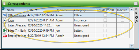 Use the Correspondence History widget to keep your list of practice-specific correspondence and documents at your fingertips. See "Correspondence Widget" for details.