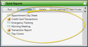 You can use the Quick Reports widget to organize and run your most frequently-used reports and patient forms without opening the Reporting window. See "Quick Reports" for details.