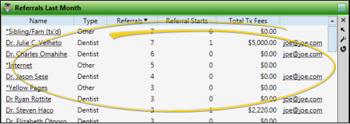 Use your Referrals widget to see up-to-date trends among your referral sources. You can view referrals for any range of dates or time periods, include only certain types of referrals, narrow the list by orthodontist or office, and sort the results by a number of data types. See "Referrals Widget" for details.