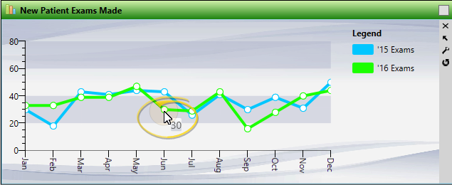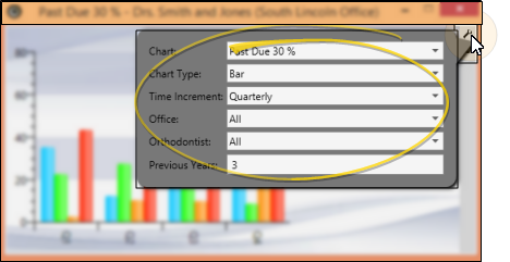 Use the Chart widget to get an overall picture of patient activity, such as the percentage of patients that are past due or the percentage of missed appointments, in a variety of formats. You can also use the Chart widget to compare data among your orthodontists and/or offices. Your selected chart data, office, and orthodontist selections are listed in the Chart widget header for easy recognition of the data you are viewing.