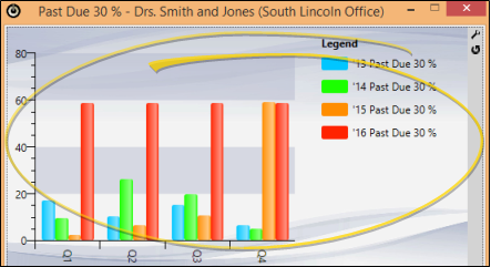**Total AR vs. Past Due 30 ** - The total of all outstanding patient balances vs. the amount that is past due 30 days or more. These statistics always show the up-do-date amounts, regardless of the time frame specified.