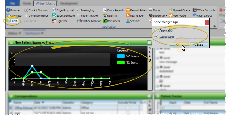 From the Application section of the Widget Library ribbon bar, choose the Chart widget, and select whether to open it as a Dashboard or Application widget.
