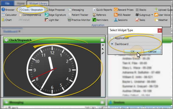From the Application section of the Widget Library ribbon bar, choose the Clock / Stopwatch widget, and select to open it as either a Dashboard or Application widget.