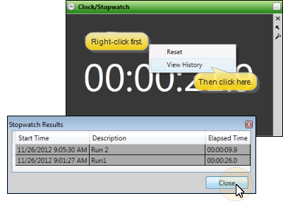 Right-click anywhere within the stopwatch widget window and select View History to open a window of the times you have recorded. You can optionally edit the descriptions of the split times. The history is cleared whenever you log out and back into Edge Cloud, or whenever you close and re-open the Clock/Stopwatch widget.