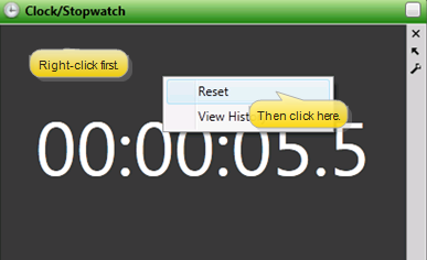 Right-click anywhere within the stopwatch widget window and select Reset to set the timer back to 0. Each time you reset the timer, the elapsed time is recorded in the history, described below.