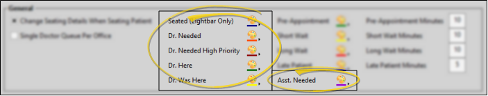 Use the color selectors in your Patient Tracker editor to choose appointment milestone colors for your Light Bar widget: Seated, Dr. Needed, Dr. Needed High Priority, Dr. Here, Dr. Was Here and Assistant Needed.