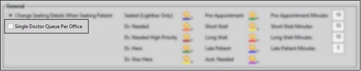 (Applies only when the Queue style is selected in your Light Bar.) Enable the Single Doctor Queue Per Office option in your Patient Tracker editor to separate patients in your Light Bar widget by the office assigned to the appointment. If this option is disabled, the light bar will separate patients by the doctor assigned to the appointment instead.