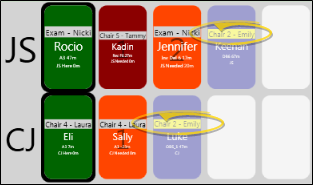 Location - This style shows patients according to the chair to which they are assigned, You cannot change the order of appointments, since they are displayed according to chair number. Also note that if multiple patients are seated in the same chair, location style will display only the first-appointed patient. Once that patient is placed in checkout in your Patient Tracker, the next-appointment patient assigned to that chair will appear in your light bar.