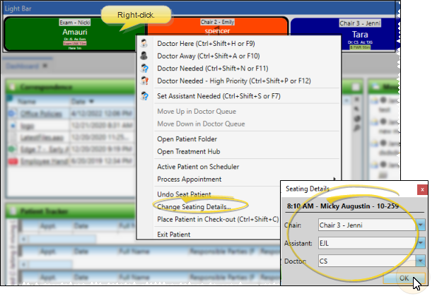 If you enable the Change Seating Details When Seating Patient option of your Patient Tracker editor, the seating details dialog pops up as soon as you seat a patient in the Patient Tracker. (Seating details include the chair, assistant, and doctor attending the patient.) You can also right-click a patient in the Seated section of your Patient Tracker or in the Light Bar widget to change the details at any time.