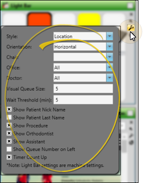 Click the Settings icon on the widget tool panel to select how the light bar appears on your screen. The widget is designed to be used chair-side, so the widget settings are machine (computer) specific, not system-wide nor operator-specific: You should choose the settings that work best for the chair this computer is assigned to.