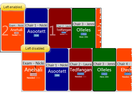 Your light bar widget uses colors, numbers, labels, and flashing to indicate the current status of a patient's appointment activity, and to direct the doctor to the next patient. When viewing the light bar in queue format, the priority of the appointment determines its place in the list. Each box includes the chair the patient is assigned to, and the number of scheduled minutes remaining for the appointment. In addition, if the patient is flagged as "Doctor is Needed" or "Doctor is Needed - High Priority", a number appears to indicate that patient's place in the queue. The box can optionally include the patient's nickname, the appointment procedure code, the orthodontist, and the assistant assigned to the appointment. (See above to choose which optional information to display.)
