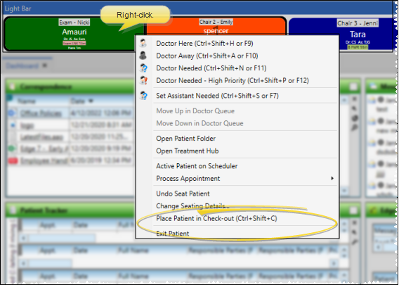Right-click the appointment, then select to Unseat or Checkout the patient. This action results in removing the appointment from your light bar as well as updating your Patient Tracker.