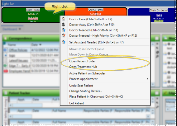 You can double-click an right-click an appointment in the light bar, then select to open the patient folder to the Home page or the Treatment Hub page.