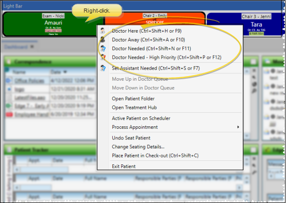 Right-click an appointment in your light bar or Patient Tracker to update its status. This changes both the color and position of the appointment, as well as accurately tracks the amount of time patients have spent in each status.