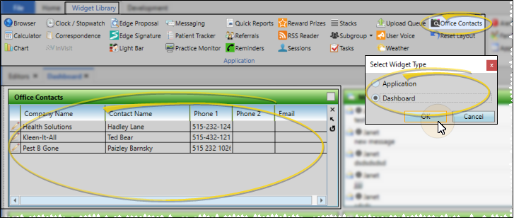 From the Application section of the Widget Library ribbon bar, choose the Office Contact widget, and select whether to open it as a Dashboard or Application widget.