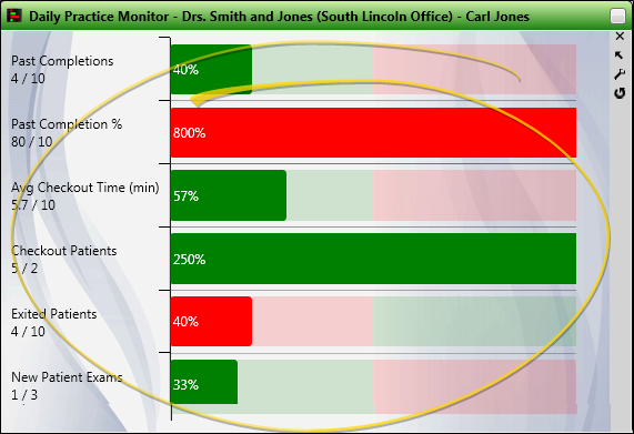 Your selected time frame, office, and orthodontist settings are listed in the Practice Monitor header for easy recognition of the data you are viewing. In addition, the current total, as well as the goals you set appear with each type of data displayed. Your progress toward each goal appears in the bar graph: Red indicates you are behind, and green indicates you are meeting or exceeding the goal.